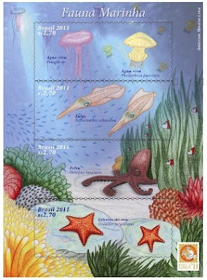 Os Correios lançam neste domingo (5/6), Dia Mundial do Meio Ambiente, na cidade de Recife/PE, um bloco (de emissão especial) composto de quatro selos, que destacam espécies da fauna marinha: Águas-vivas (Pelagia sp e Phyllorhyza punctata), Lulas (Sepioteuthis sepioidea), Polvo (Octopus insularis) e Estrelas-do-mar (Oreaster reticulatus). O bloco Ilustra o habitat dessas espécies como: algas, corais e fundo de areia, além de outros habitantes naturais, como os peixes. No canto inferior direito, a logomarca da Exposição Filatélica Internacional no Japão – Philanippon 2011, a ocorrer em Yokohama, no período de 28/7 a 2/8/2011. Na composição da peça filatélica, o artista Anderson Moreira Lima utilizou as técnicas do desenho com lápis de cor em papel Canson e computação gráfica.