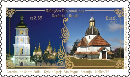 O selo divulga duas igrejas Cristãs Ucranianas, uma na cidade de Kyiv, Ucrânia, e outra na colônia ucraniana brasileira, na cidade de Mallet, no estado do Paraná. À esquerda, visualiza-se a Catedral de Santa Sofia, com suas cúpulas douradas, de arquitetura bizantina, o primeiro monumento ucraniano inscrito na Lista de Patrimônio Mundial da UNESCO. À frente, destaca-se o suntuoso Campanário da Catedral com quatro andares. À direita, a Igreja de São Miguel Arcanjo, a primeira construída no Brasil por imigrantes ucranianos; as paredes são triplas, onde a madeira foi encaixada com pouco uso de pregos, trata-se de um bem histórico, cultural e patrimonial. O contraste das cores, ao fundo, no selo, retratando a noite e o dia, expressa, no conjunto, o relacionamento, a integração e o respeito entre os dois países. A criação das molduras usadas como acabamento foi inspirada na cultura ucraniana, bem como usado um grafismo decorativo como ornamento do selo, lembrando os bordados, xilogravuras e os tradicionais ovos pêssanka ucranianos. Foram utilizadas as técnicas de fotografias, por Mem. Nac. Sofia Kyïvska e Gilson Camargo, e desenho gráfico, pelo Departamento de Filatelia e Produtos da ECT.